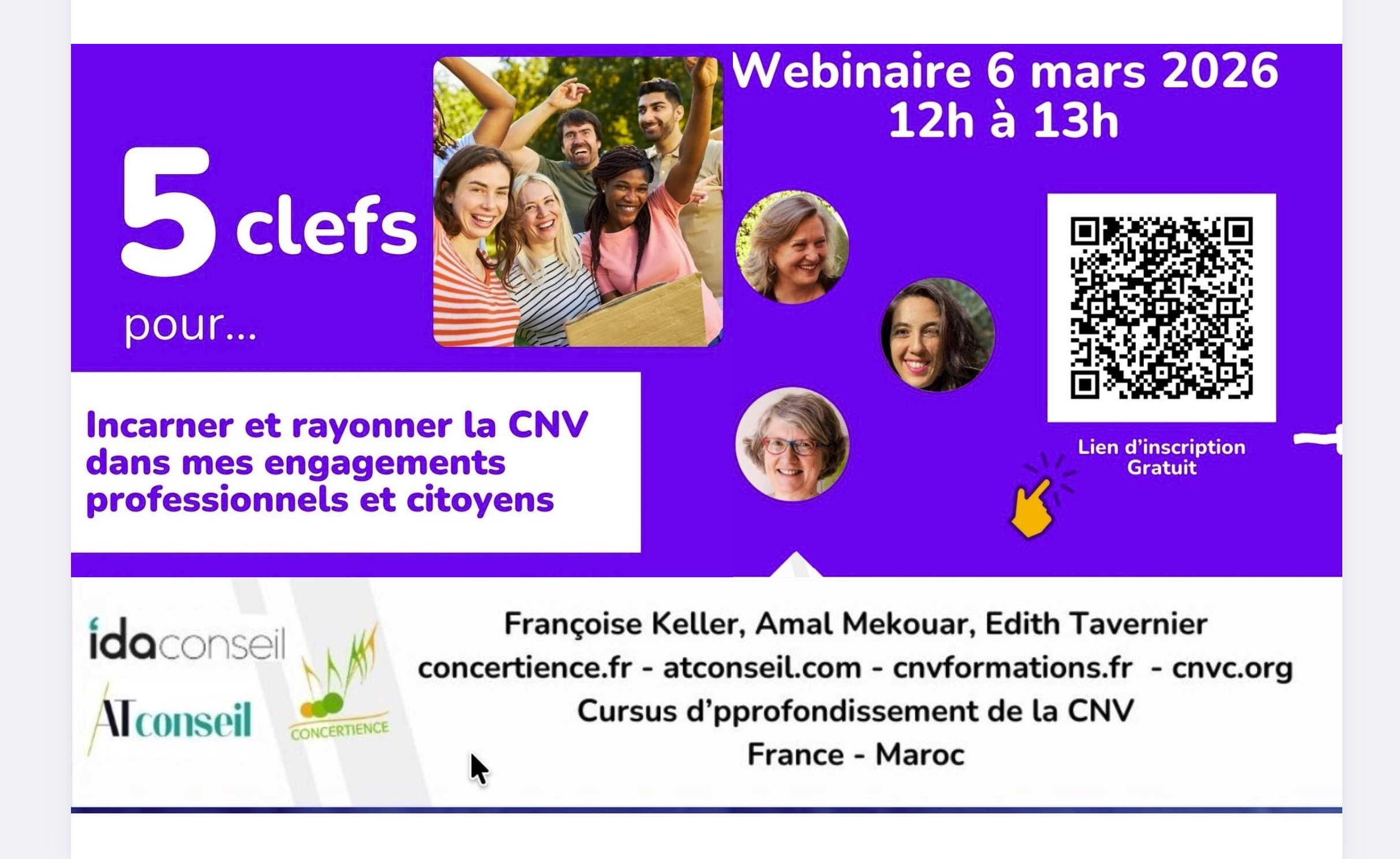 Une heure pour nous ressourcer, nous inspirer et vous présenter le cursus d’approfondissement de la CNV que nous continuons de faire évoluer depuis 15 ans et que nous animons en France et au Maroc.